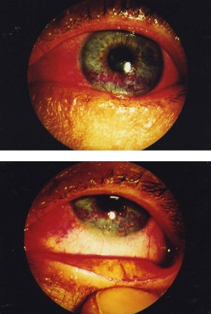 При биомикроскопии глаза, которая выполняется с помощью щелевой лампы, обращается внимание на положение глазного яблока (наличие экзофтальма), состояние век (таблица 2), конгруэнтность передней поверхности глаза и задней поверхности век, состояние слезных менисков, роговицы и конъюнктивы глаза. В свете щелевой лампы в больных с ССГ имеет место утончение или отсутствие слезных менисков. На этом месте по обыкновению находят отекшую и тусклую конъюнктиву, которая "наползает" на край века (рис.3). При дефиците водной компоненты СП в последней увеличивается доля слизи и липидов в связи с чем они хорошо заметны на поверхности глаза (рис.4). Слизь и слущенные эпителиальные клетки часто формируют тонкие слизистые нити, которые вызывают в больных значительный дискомфорт. Дисфункция мейбомиевых желез вызывает утолщение век, их гиперемию, расширение выводных протоков желез, явления секреторного застоя.