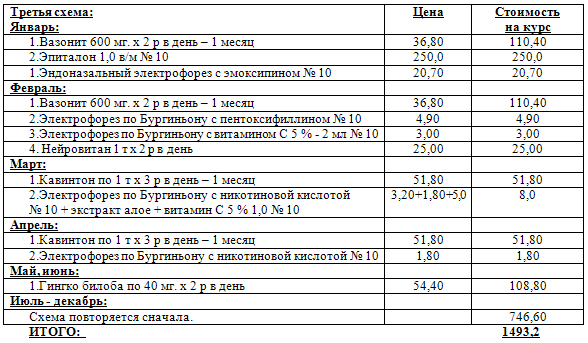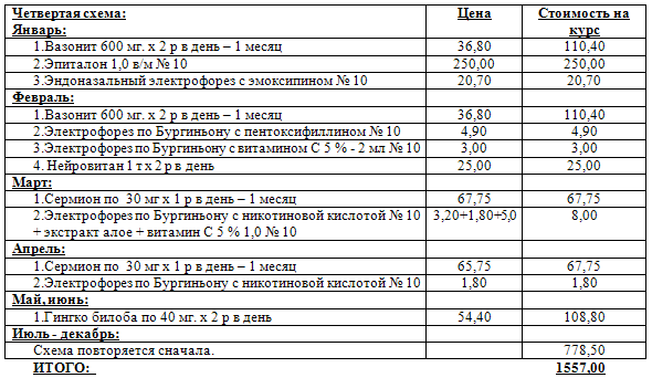 Учитывая все вышеизложенное, нашей задачей являлось составление схемы лечения при которой отсутствовал бы «медикаментозный стресс», наблюдающийся при назначении большого количества препаратов и в больших дозах. Лечение должно быть направлено на постоянное поддержание уровня гемодинамики и улучшения трофики в ишемизированных тканях. Оно должно хорошо переноситься пациентом, быть доступным, не требовать постоянного пребывания на больничной койке, т.е. проводиться в домашних условиях. К тому же с целью предотвращения медикаментозного стресса схема лечения должна быть разработана на длительный период, одномоментно не должно применяться большого количества препаратов (не более 2-3). Кроме того, при составлении схемы лечения предпочтение отдавалось препаратам, обладающим более широким спектром действия, сочетающим в себе воздействие на различные звенья патогенеза.